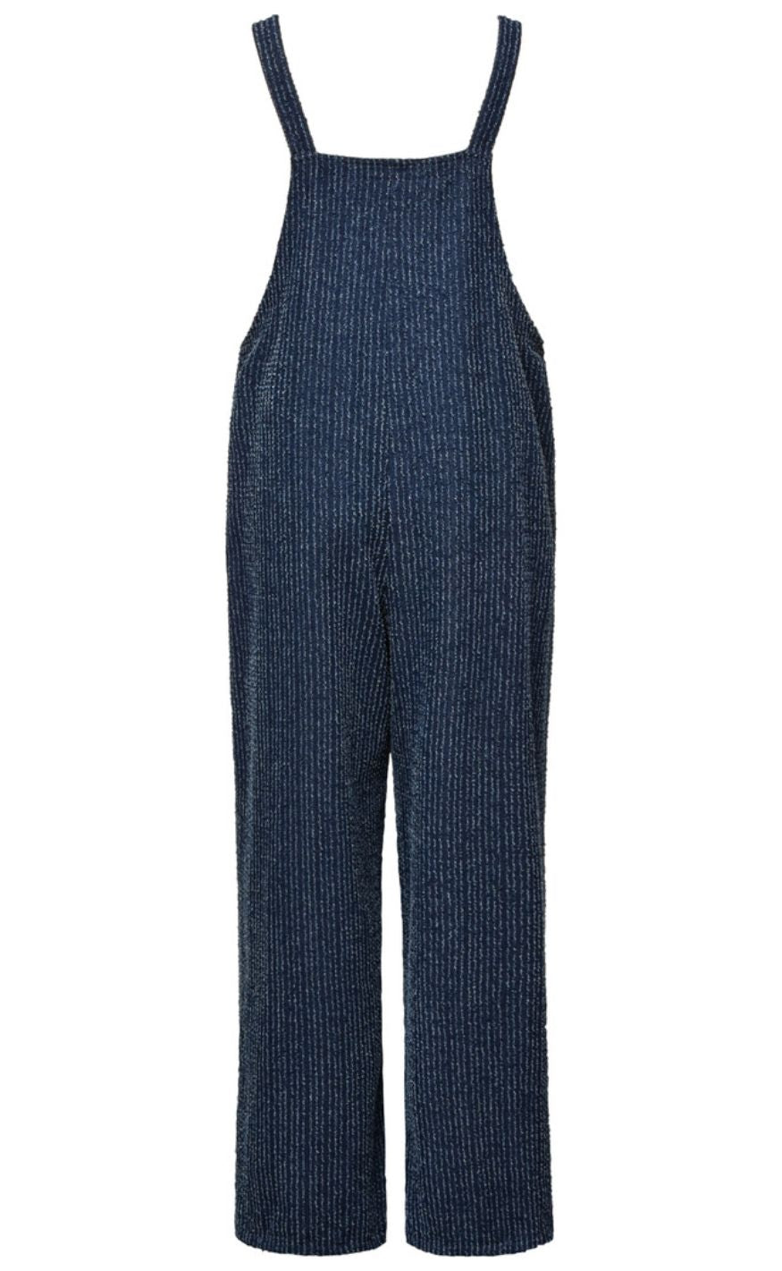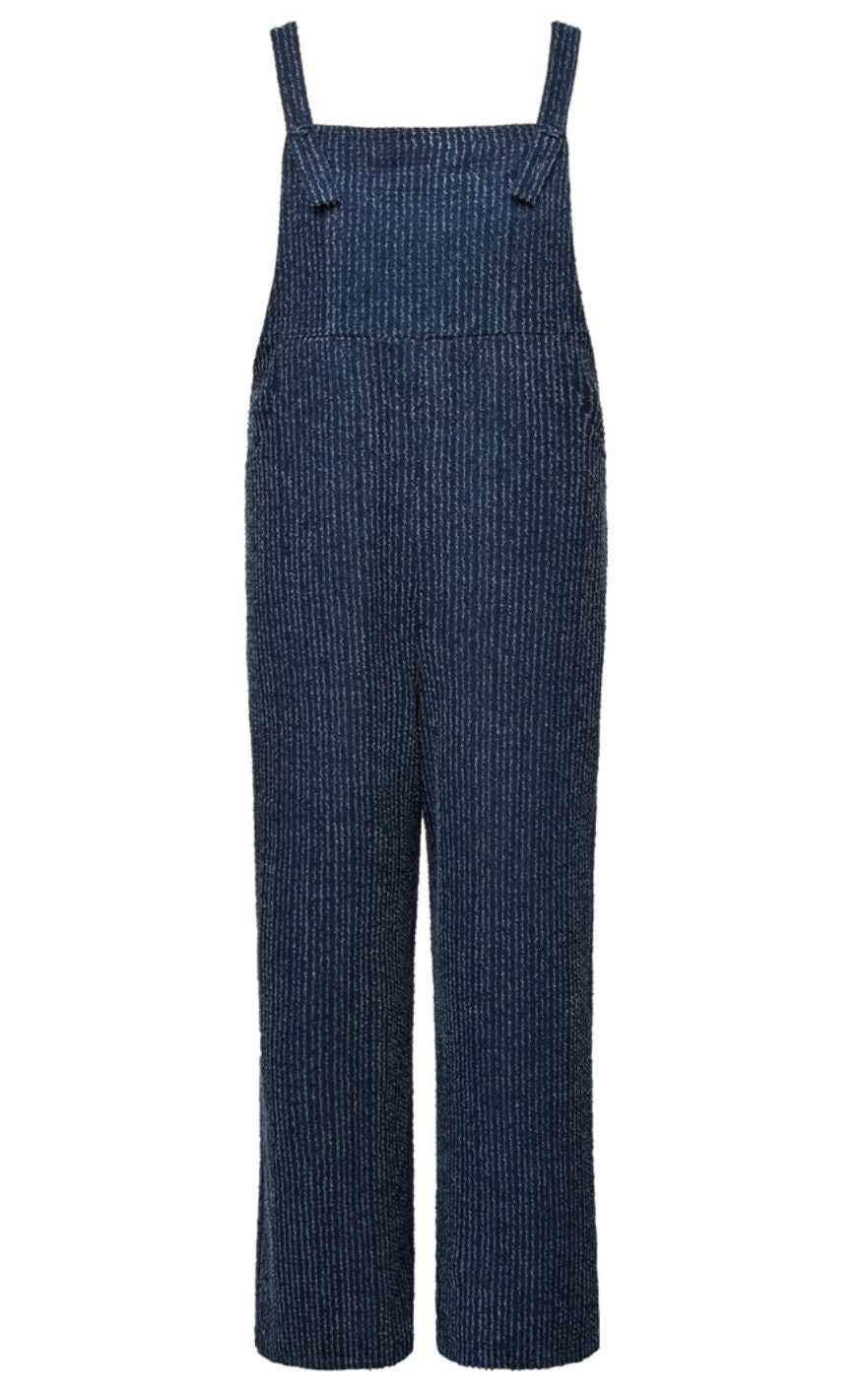 Cool og tidløs overall i et struktureret materiale med fine lodrette striber. Den har justerbare stropper og et enkelt snit, der giver et afslappet udtryk.