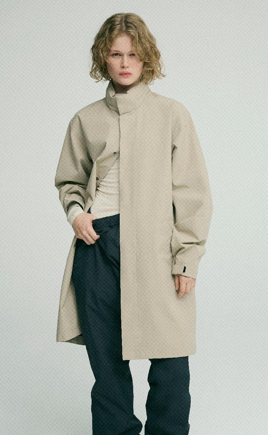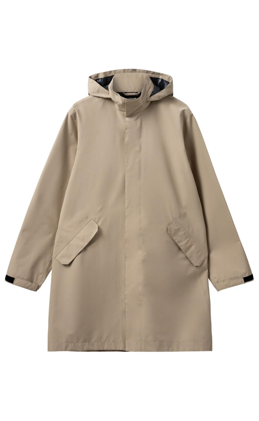 Regnjakken er en lang model med justerbar hætte, sidelommer med magnetlukning og en skjult knaplukning.